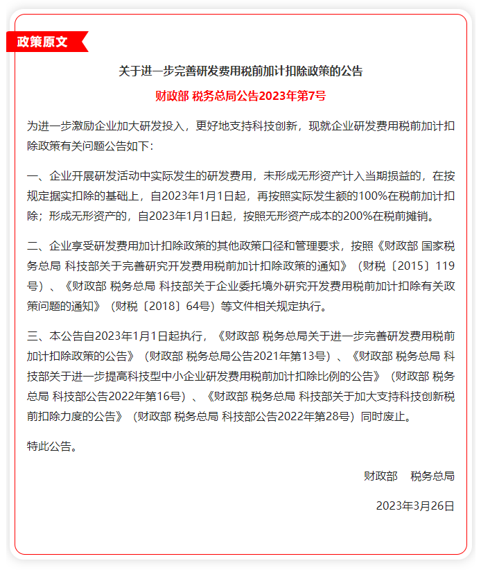 自2023年1月1日起,研發(fā)費用加計扣除比例統(tǒng)一提高至100%。